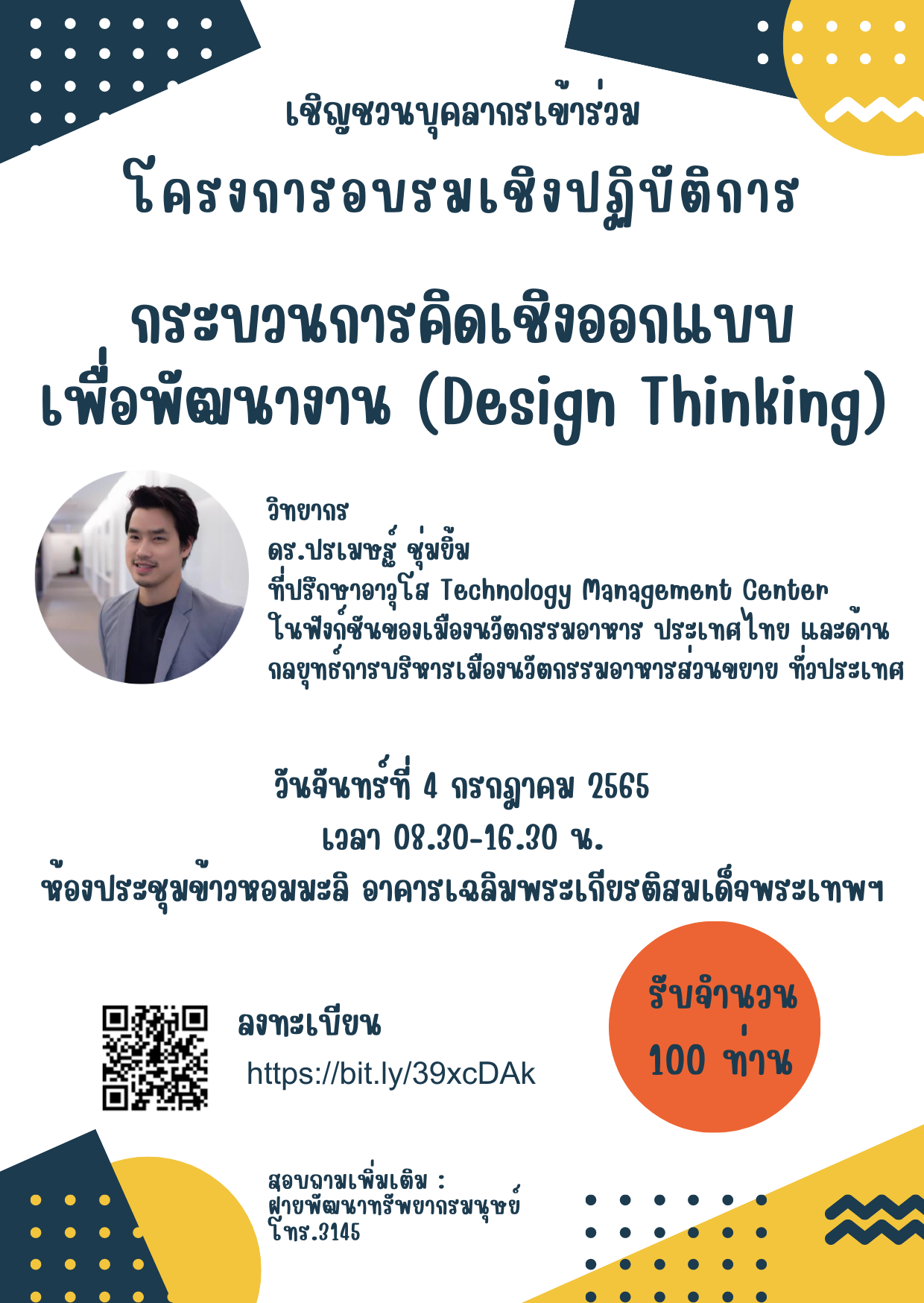 ขอเชิญเข้าร่วมโครงการอบรมเชิงปฏิบัติการ "กระบวนการคิดเชิงออกแบบเพื่อพัฒนางาน (Design Thinking)"